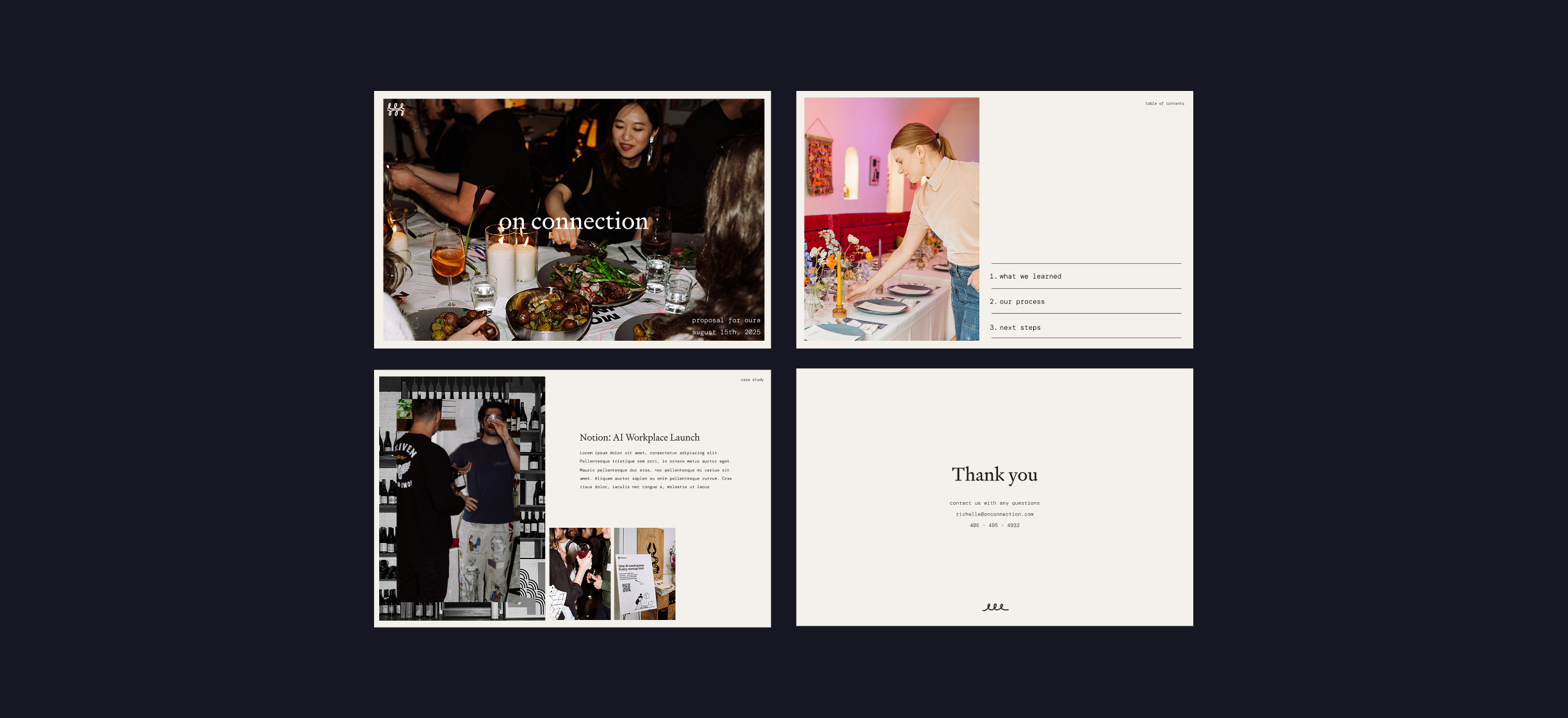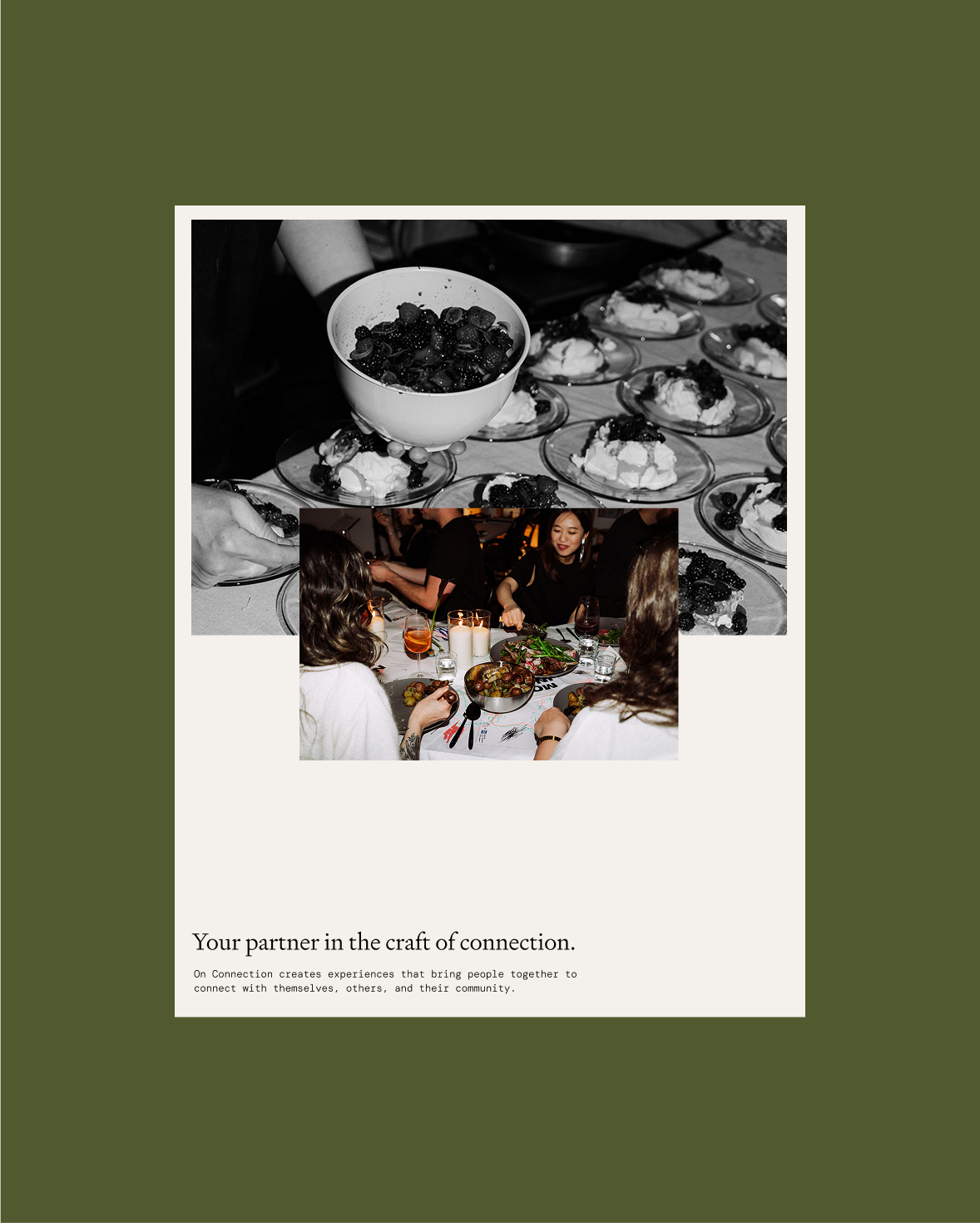 On Connection offers connection-based experiences for companies, brands, and communities, bringing people together through meaningful encounters. Operating across two distinct yet complementary offerings, they host intimate public dinner series in the Bay Area while also crafting bespoke experiences for private clients. What sets them apart is their commitment to intentional curation: every public dinner weaves together personal growth themes with support for local small businesses, creating evenings where conversation and connection flows . They serve as a creative conduit, translating client visions into immersive realities with meticulous attention to atmosphere, flow, and emotional resonance.